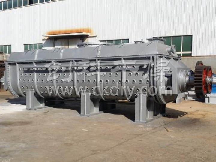 空心軸上密集排列著楔型中空漿葉,熱介質(zhì)經(jīng)空心軸流經(jīng)漿葉。單位有效容積內(nèi)傳熱面積很大,熱介質(zhì)溫度從-40℃到320℃,可以是水蒸汽,也可以是液體型:如熱水、導(dǎo)熱油等。間接傳導(dǎo)加熱,沒(méi)有攜帶空氣帶走熱量,熱量均用來(lái)加熱物料。熱量損失僅為通過(guò)器體保溫層向環(huán)境的散熱。楔型漿葉傳熱面具有自清潔功能。物料顆粒與楔型面的相對(duì)運(yùn)動(dòng)產(chǎn)生洗刷作用,能夠洗刷掉楔型面上附著物料,使運(yùn)轉(zhuǎn)中一直保持著清潔的傳熱面。漿葉干燥機(jī)的殼體為Ω型,殼體內(nèi)一般安排二到四根空心攪拌軸。殼體有密封端蓋與上蓋,防止物料粉塵外泄而充分發(fā)揮作用。